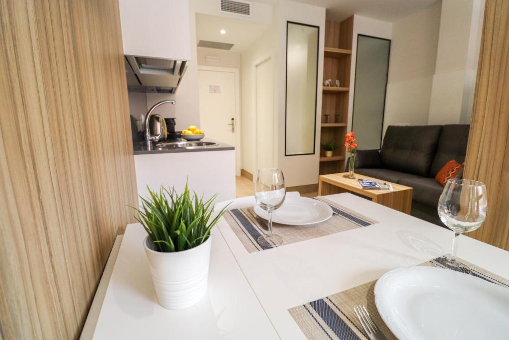 Cada estudio incorpora cocina americana equipada, mesa de comedor y sofá cama, pensados para quienes preferimos una estancia flexible, ya sea en pareja, en familia o en estancias medias. El escritorio y el WiFi gratis facilitan combinar trabajo y escapada urbana.