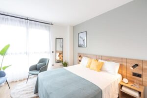 La zona combina amplias avenidas, espacios verdes y servicios modernos, ideal para quienes buscan una base práctica para escapadas urbanas, viajes de trabajo o estancias medias en Madrid, manteniendo siempre una sensación de calma y orden.