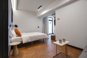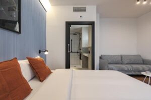 Cada suite nos recibe con aire acondicionado y baño privado, creando un refugio funcional para descansar tras explorar la ciudad. La cafetera en la habitación invita a marcar nuestro propio ritmo por la mañana, mientras que la ropa de cama y el secador de pelo completan una experiencia sencilla pero cuidada.