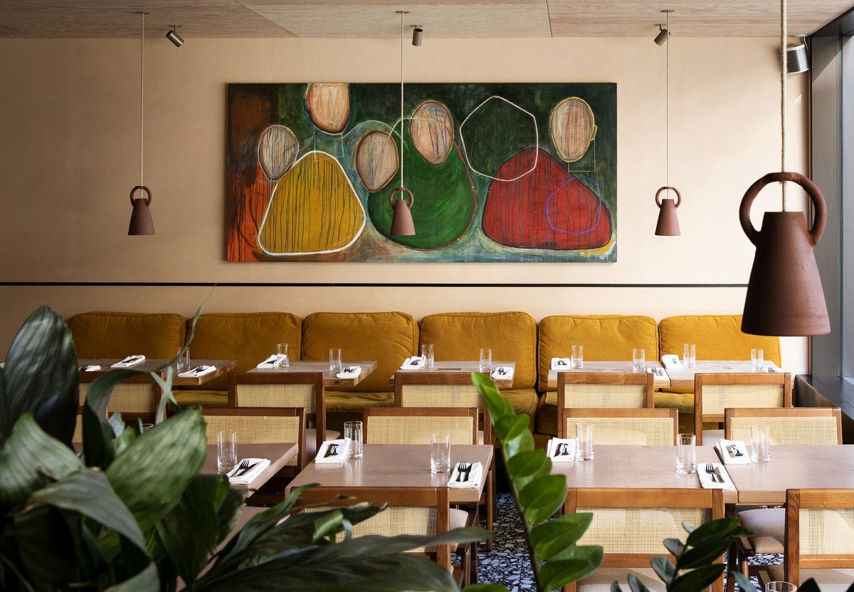 Set in a glass-fronted space in a sleek, somewhat corporate development, Ikoyi, a Michelin-starred newcomer, feels surprisingly homey. The interiors are by Sophie Ashby, a rising design-scene star who’s softened the dining room with earthenware lights and richly grained elm tables. Lush foliage and slouchy, mustard-yellow banquettes add to the effect. The playlist is controlled by the chefs; on a recent visit, it ranged from GZA to Led Zeppelin. In short, the restaurant is elegantly unpredictable—which all makes sense when you see the menu.