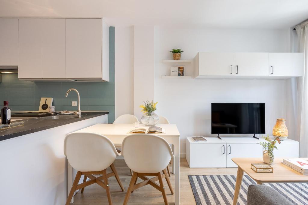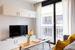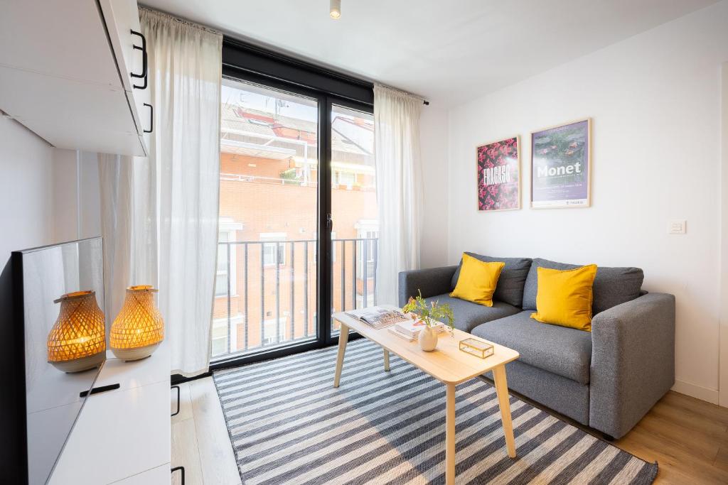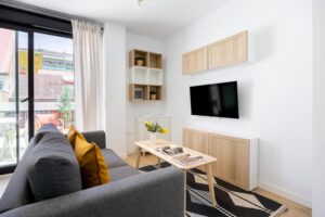 Le coin salon se transforme en notre petit salon madrilène, avec une télévision à écran plat pour se détendre et un mobilier pensé pour les séjours courts comme prolongés, en conservant toujours une sensation d'intimité et d'ordre.