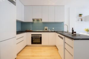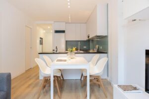 Dans l'appartement, nous trouvons une cuisine entièrement équipée avec coin repas, réfrigérateur, lave-vaisselle, four, cafetière et bouilloire, idéale pour ceux qui apprécient la liberté d'organiser leurs propres horaires et repas en toute autonomie.