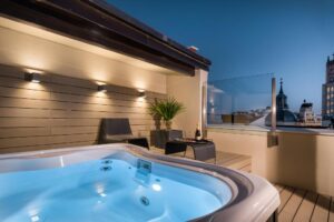 La terrasse avec piscine surélevée est l'un des grands atouts de l'Hôtel Catalonia Gran Vía. De là, on s'offre des vues directes sur la Gran Vía tout en se déconnectant du rythme de la rue. C'est un refuge parfait pour une baignade en fin de journée ou un moment de calme avant la nuit madrilène.