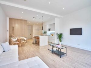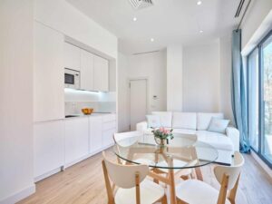 Appart'hôtel dans un quartier calme de Madrid avec des suites spacieuses, cuisine entièrement équipée, wifi gratuit, salle de bains privative et terrasse solarium, idéal pour les séjours indépendants.
