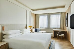 Las habitaciones del Hotel Madrid Marriott Princesa Plaza son amplias, con grandes ventanales que inundan de luz natural la zona de estar. El equipamiento responde a lo que esperamos de un cuatro estrellas urbano: TV vía satélite, aire acondicionado y una distribución pensada para trabajar, descansar y organizar el día en Madrid con comodidad.