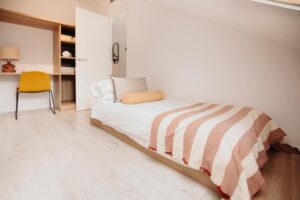 The living area invites a breather between museum visits, with functional yet contemporary décor tailored for travellers who appreciate practical comfort without sacrificing refined aesthetics.