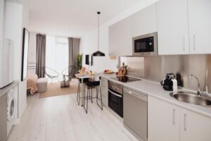 Each apartment features a fully equipped kitchen with dining area, fridge, dishwasher, oven, coffee maker and kettle. This setup allows for leisurely breakfasts, light lunches before exhibitions or late dinners after a show in the centre, all on your own schedule.