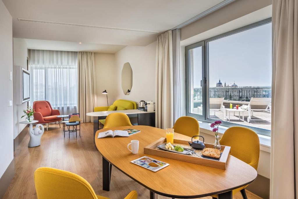 Hotel Barceló Torre de Madrid: 5-star hotel with a strategic location in Plaza de España/Gran Vía. It offers spacious rooms with king-size beds, an indoor pool, fitness centre, sauna, à la carte restaurant and DJ lounge bar. Renowned for its modern design and 24-hour service. Location rating: 9.6.