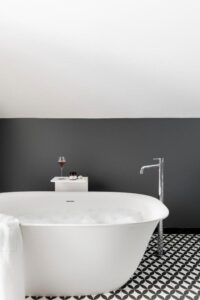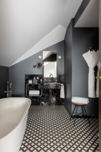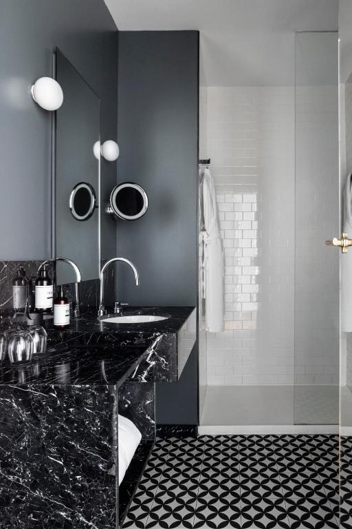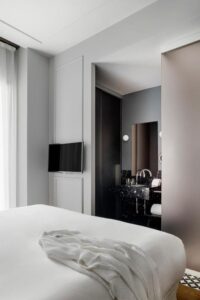The rooms, featuring herringbone floors and a modern palette, come complete with sleek black marble bathrooms and carefully selected amenities—a testament to the hotel’s obsession with detail. The vibe is intimate and urban, crafted for guests who value design as much as comfort.